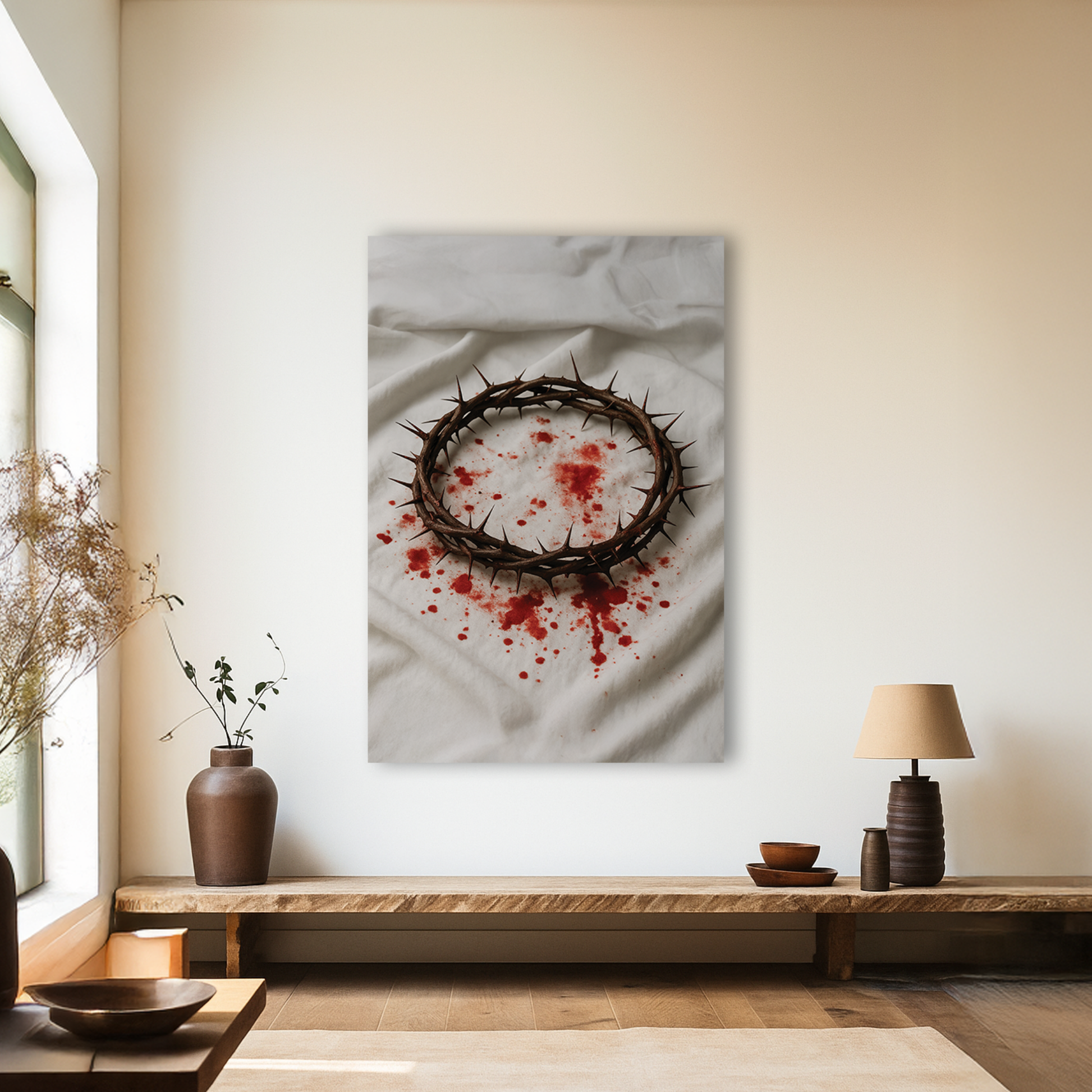 A powerful reminder of sacrifice, redemption, and unconditional love. The crown of thorns resting on a cloth stained with blood captures the cost of grace and the depth of mercy. It speaks of pain endured willingly, a symbol of victory through suffering and salvation through surrender. Every mark tells the story of love strong enough to bleed.