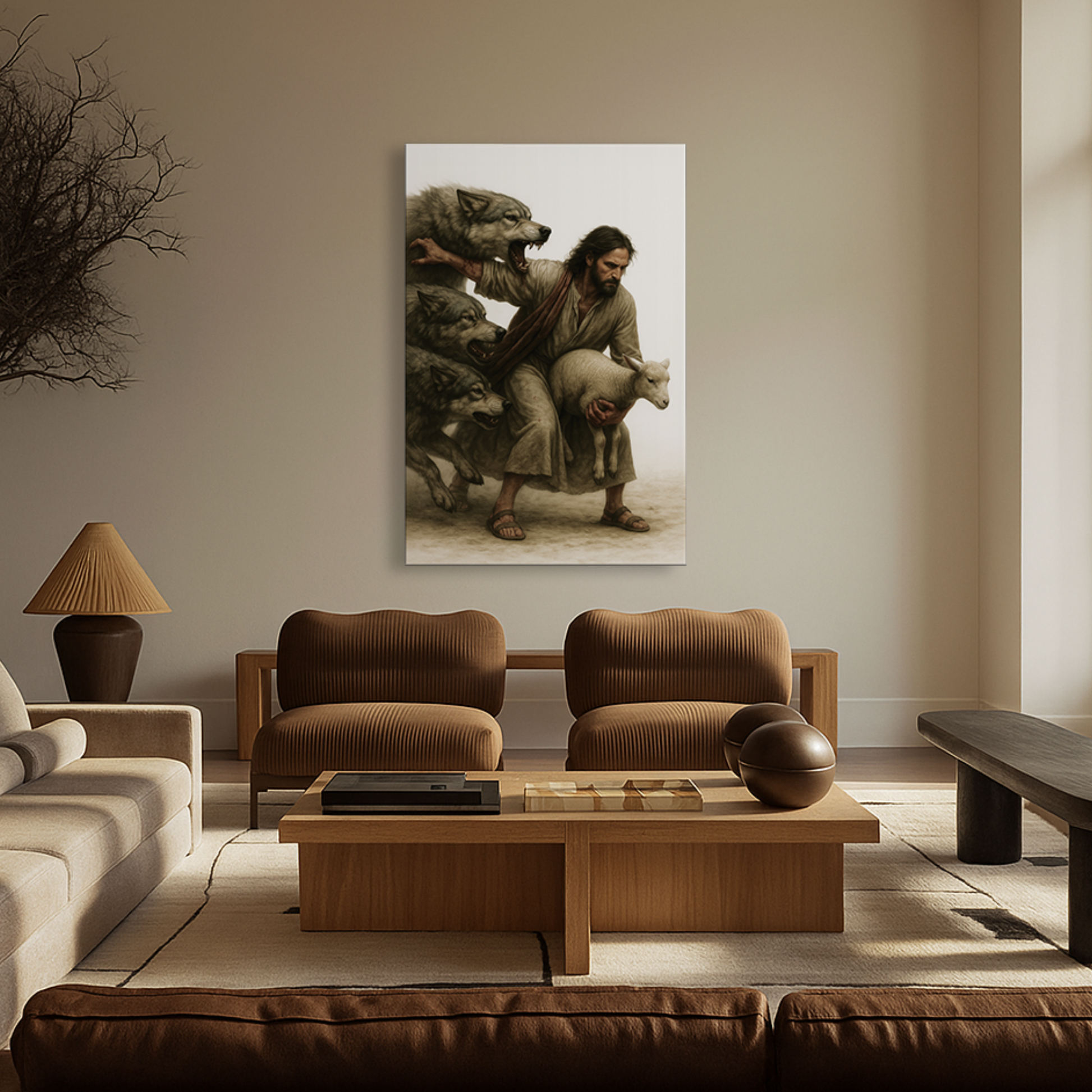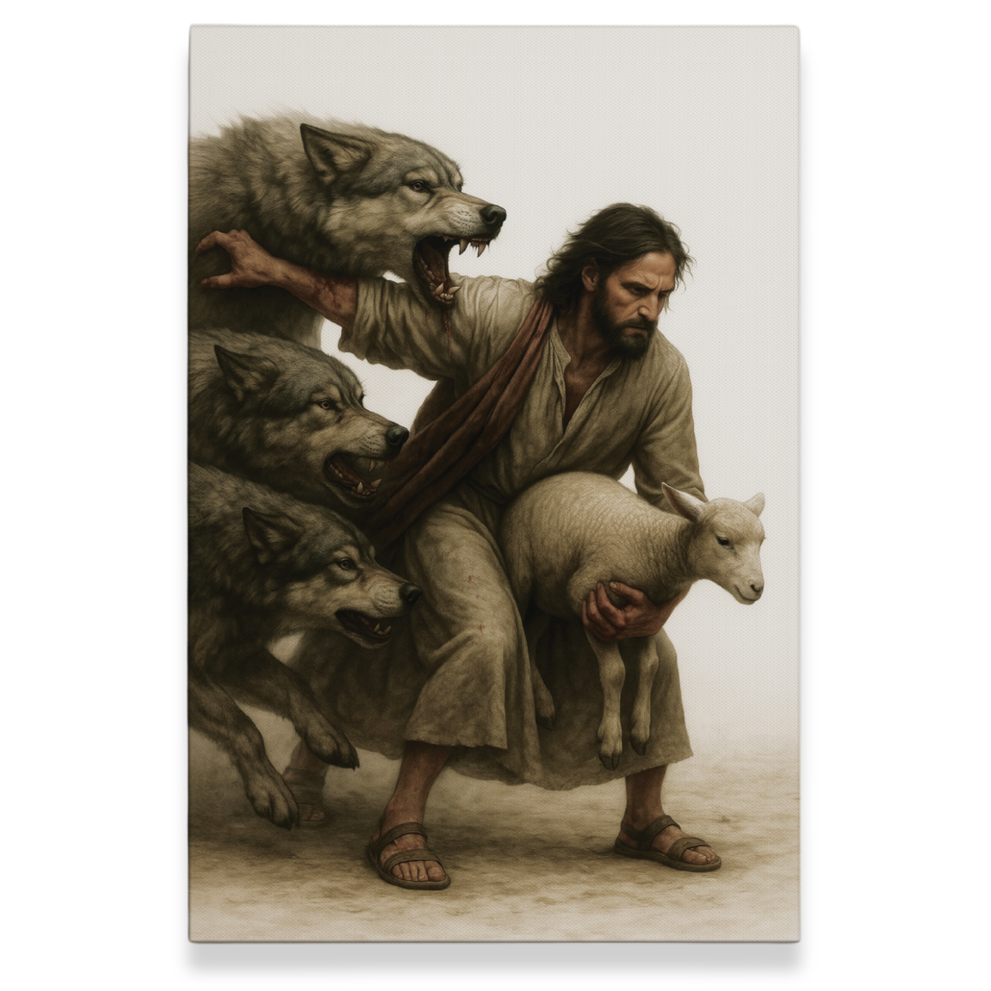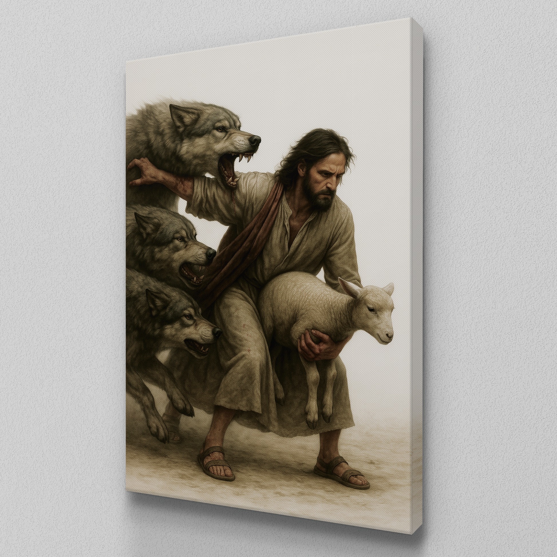Unyielding courage meets divine love. Even surrounded by darkness and danger, the Shepherd never falters. His strength isn’t in force but in sacrifice — protecting the helpless, standing firm when fear closes in. Evil may roar, but love stands taller.